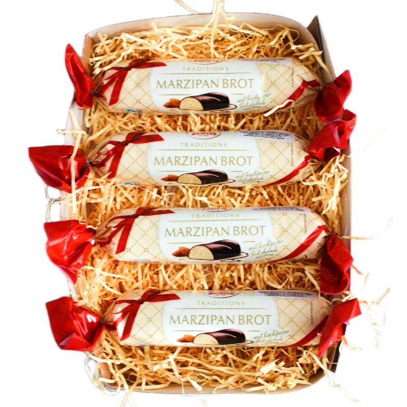 В составе 4 батончика с марципаном Marzipan Brot весом 100 грамм каждая. Подарочный набор упакован в крафт-коробку, перевязанную красной лентой.